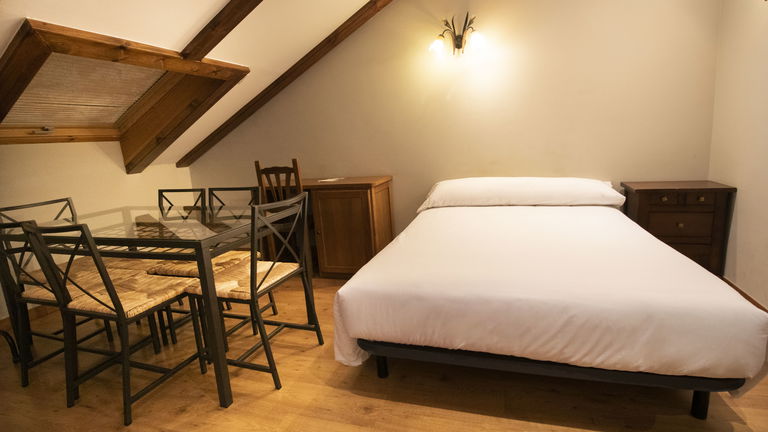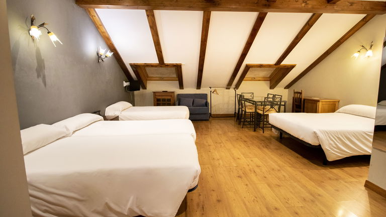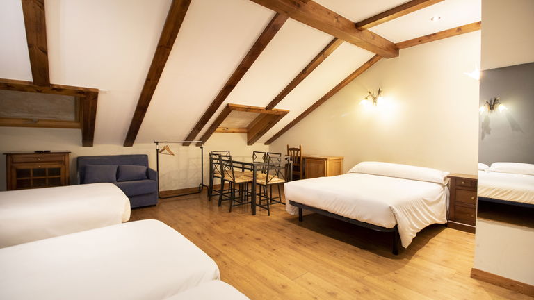 Dispone de una cama de 135 cm, una cama de 110 y dos camas de 90 cm, armario, escritorio, TV de pantalla plana, baño privado (ducha), conexión Wi-Fi gratuita, cocina equipada.