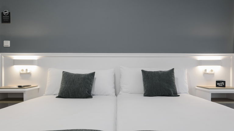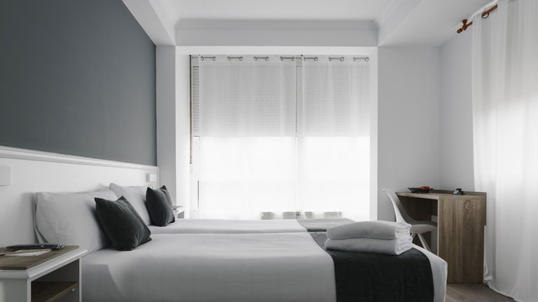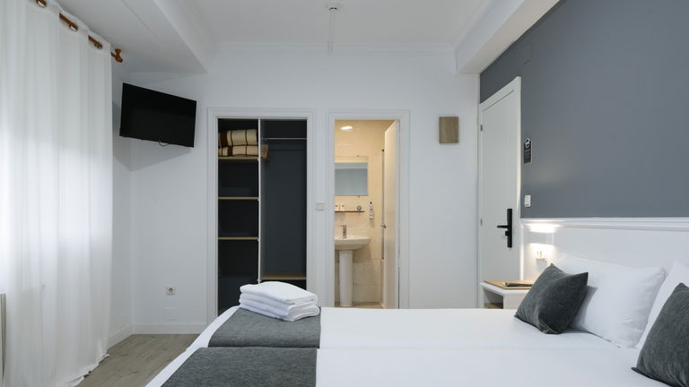 Habitación exterior, amplia con dos camas individuales de 90 cm, armario, escritorio, TV de pantalla plana, baño privado, conexión Wi-Fi gratuita.
