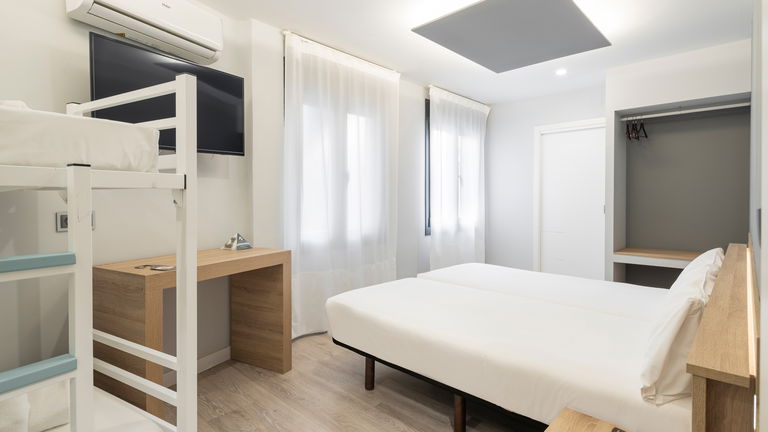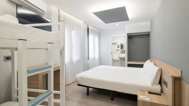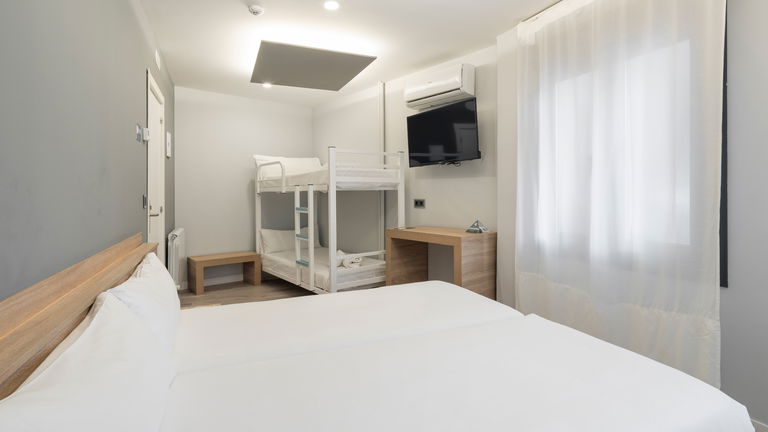 Esta es la mejor opción si viajas en familia o en grupo. Esta habitación tiene dos camas individuales y una litera con dos camas. Cuenta con baño privado, aire acondicionado y calefacción, entre otros.