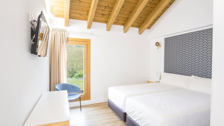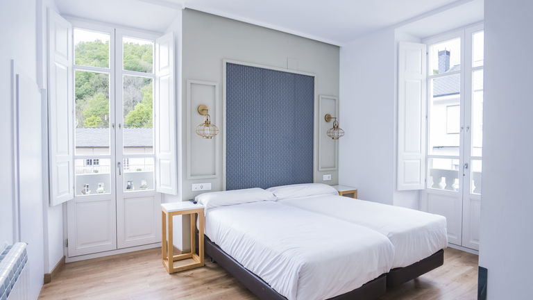 Habitaciones exclusivas, espaciosas, luminosas y diseñadas con un estilo contemporáneo. Disponen de dos camas individuales y todos los servicios y equipamientos para disfrutar de una estancia inolvidable durante tu Camino a Santiago. Además, ofrecen Wi-Fi gratuito y TV de pantalla plana. La habitación destaca por su mobiliario moderno, suelo de tarima y un diseño que ayudará a tu descanso.