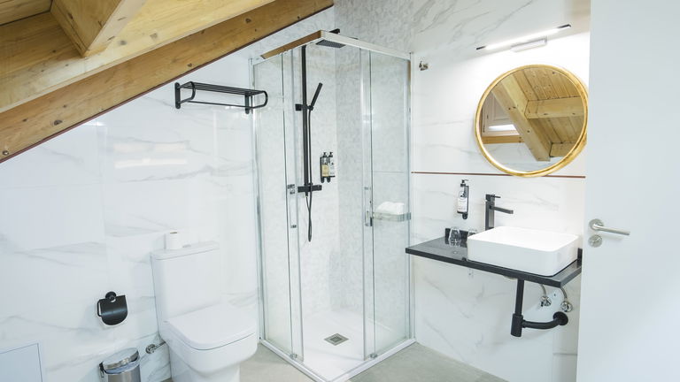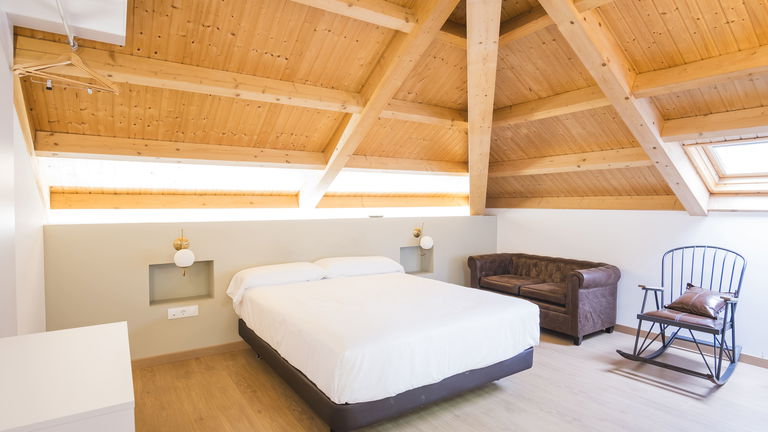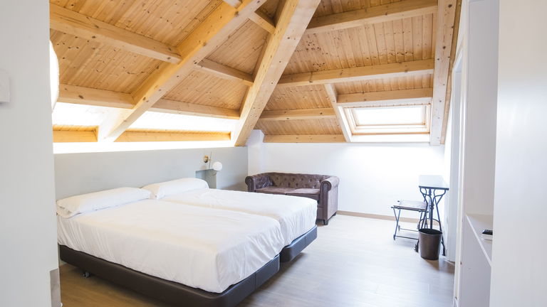Habitaciones abuhardilladas, exclusivas, espaciosas, luminosas y diseñadas con un estilo contemporáneo. Disponen de dos camas individuales o una cama de matrimonio y todos los servicios y equipamientos para disfrutar de una estancia inolvidable durante tu Camino a Santiago. Además, ofrecen Wi-Fi gratuito y TV de pantalla plana y aire acondicionado. La habitación destaca por su mobiliario moderno, suelo de tarima y un diseño que ayudará a tu descanso.