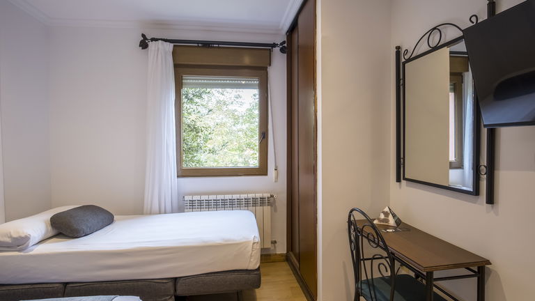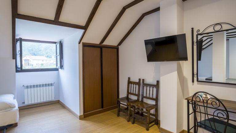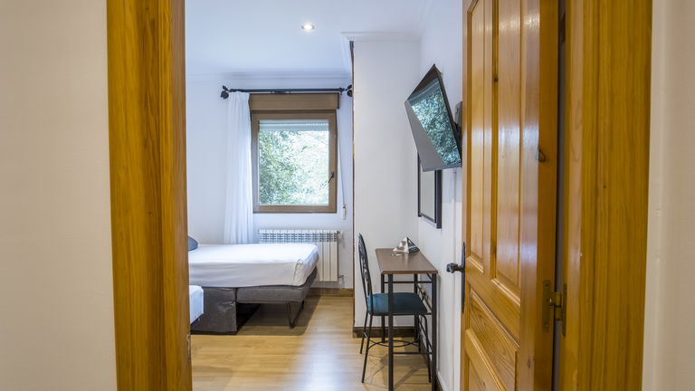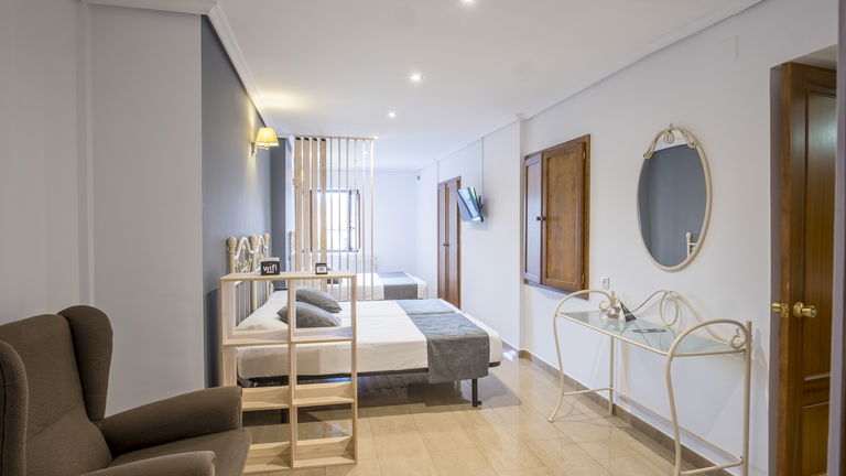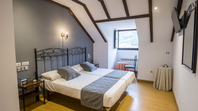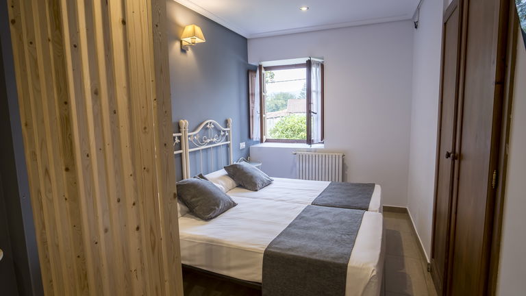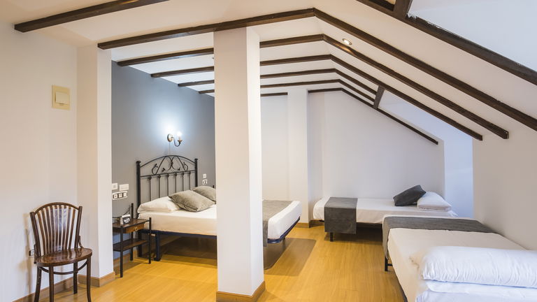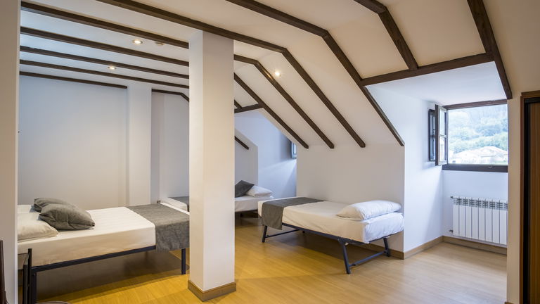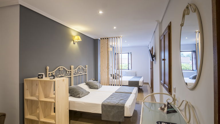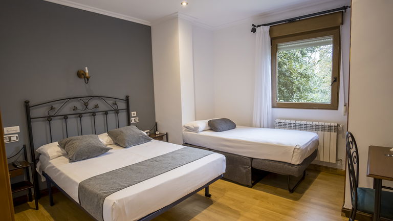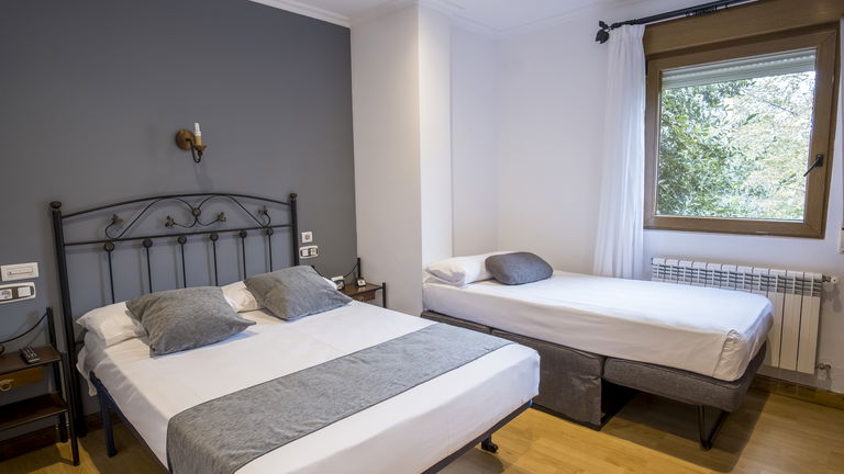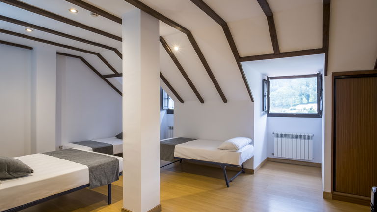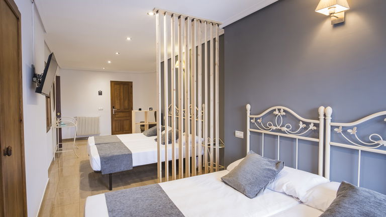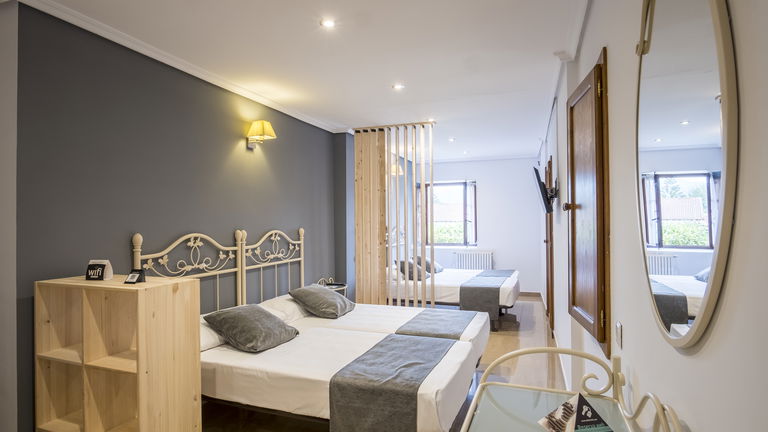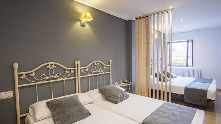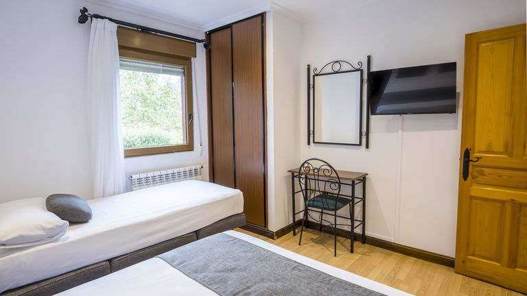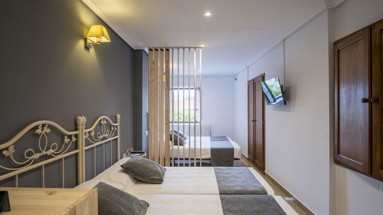 Dispone de una cama doble de 150 cm y dos camas individuales de 90 cm o cuatro camas individuales de 90 cm, armario, escritorio, TV de pantalla plana, baño privado con bañera, conexión Wi-Fi gratuita.