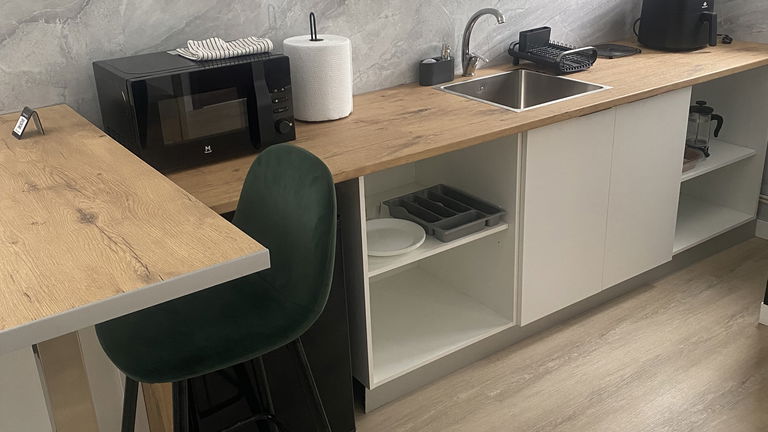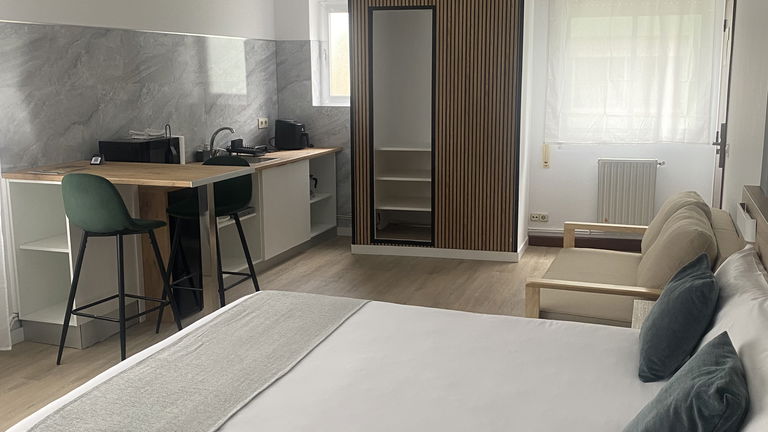 Dispone de una cama de 1,35 y sofá cama de 1,35, armario, escritorio, TV de pantalla plana, conexión Wi-Fi gratuita, microondas, airfryer, cafetera francesa, platos, cubiertos, tazas, vasos y nevera