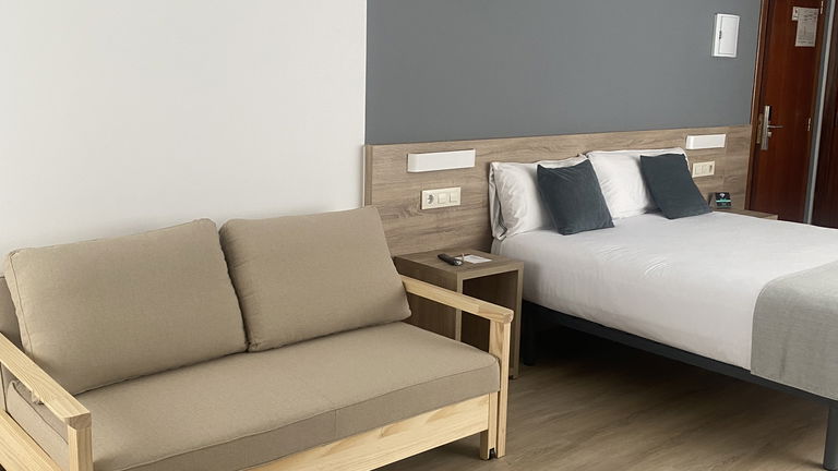 Dispone de cuatro camas de 90 cm, armario, escritorio, TV de pantalla plana, conexión Wi-Fi gratuita,microondas, airfryer, cafetera francesa, platos, cubiertos, tazas, vasos y nevera